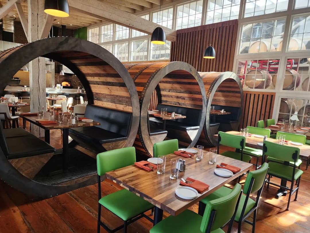 The restaurant is known for its warm and inviting ambiance, making it a perfect spot for a romantic dinner or a casual meal with friends. The decor is rustic yet modern, with vintage signage and cozy barrel-shaped booths that create a welcoming environment.